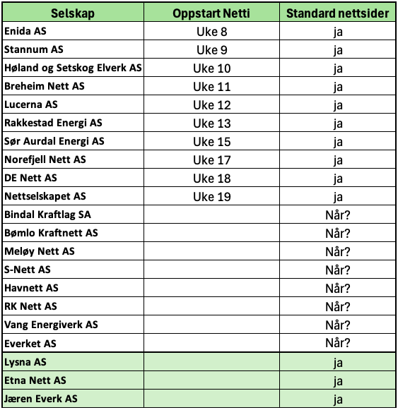Hvis dere er klare, går Netti live allerede under møtet. Vi anbefaler at dere deretter forteller kundene deres at Netti er på plass. Se utrullingsplanen nedenfor, og hvis tidspunktet ikke passer, kan dere eventuelt bytte uke med et annet selskap.