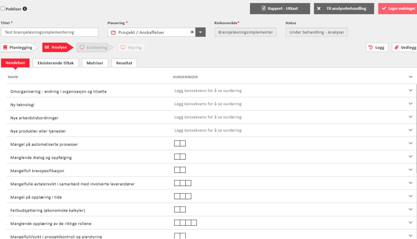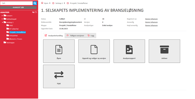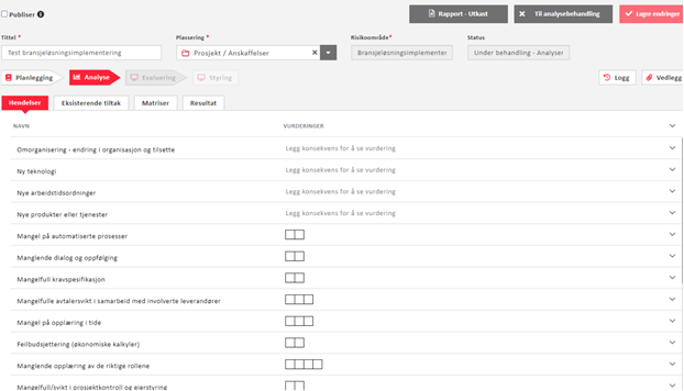 Når dere skal gjøre en ROS-analyse, må dere må selv opprette en risikoanalyse, velge å bruke input fra forhåndsdefinerte hendelser, og deretter fylle ut de forhåndsdefinerte hendelsene. Så må dere gjennomføre risikoanalysen selv, ved å vurdere sannsynlighet og konsekvens utifra hendelsene som vi har laget, før det i iverksettes eventuelle tiltak.